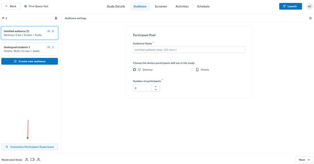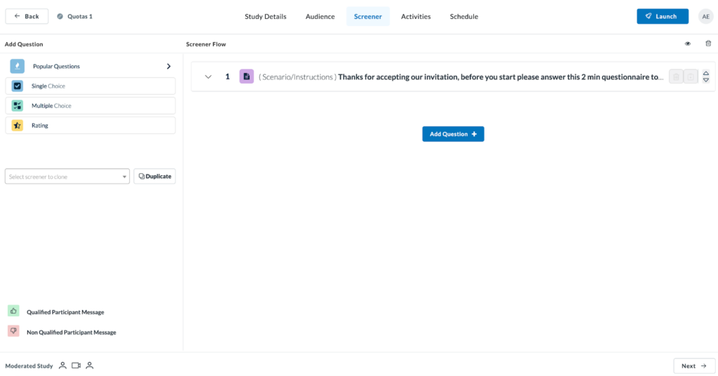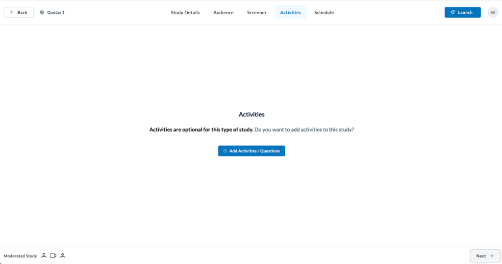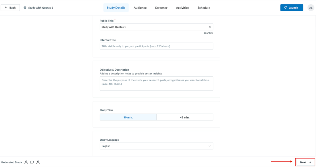 Once done, proceed to fill out your Screener, Activities and Schedule information and launch your study.