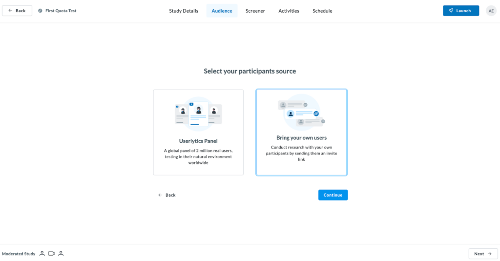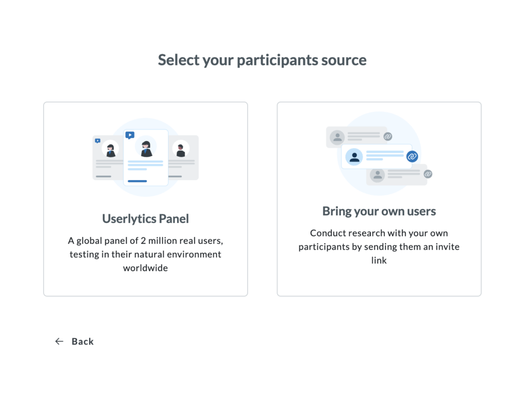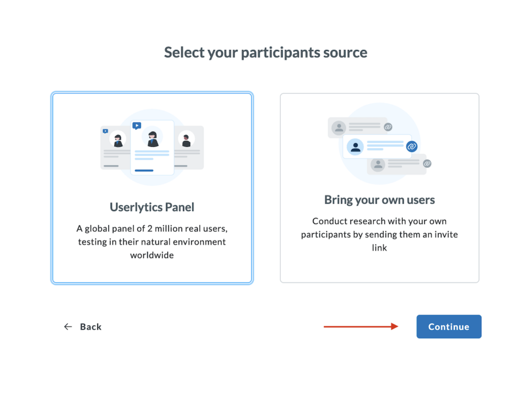 Select your participant source. Choose from the Userlytics panel or bring your own participants (users).