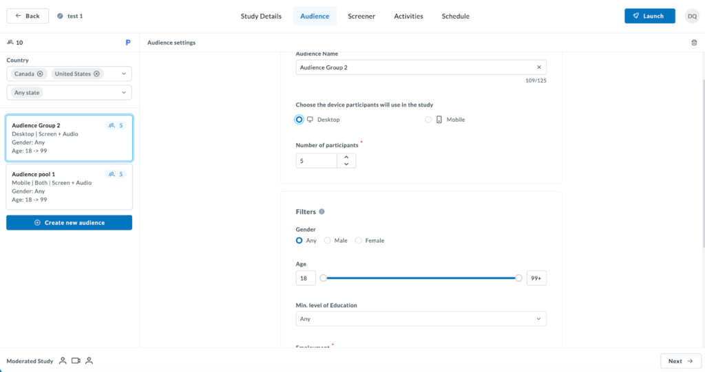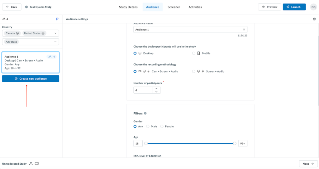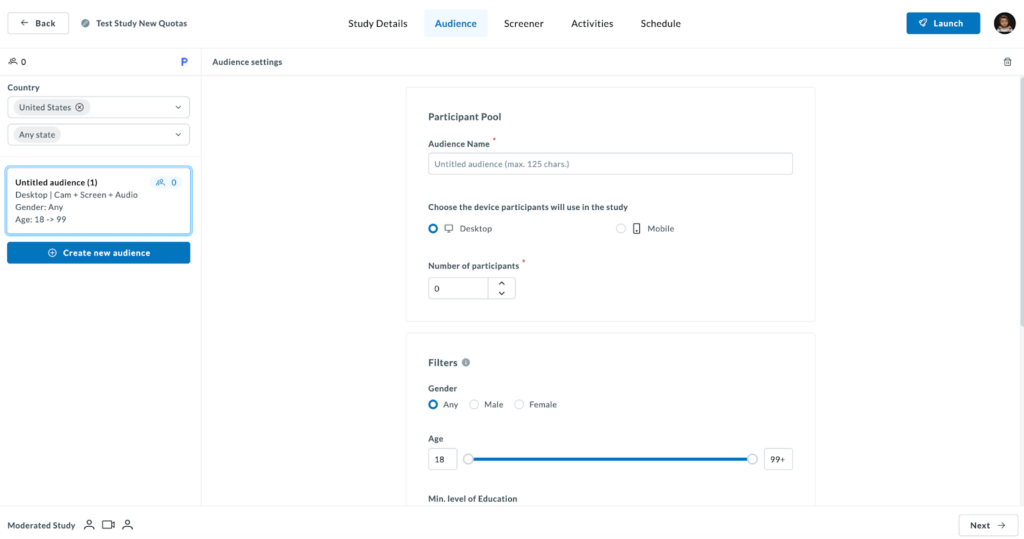 Once you enter the Audience tab, begin filling out the participant pool information. You’ll see the information entered reflected on the left-hand panel, where you can also choose the country or countries you want to source your participants from, and narrow down by “State” if needed.