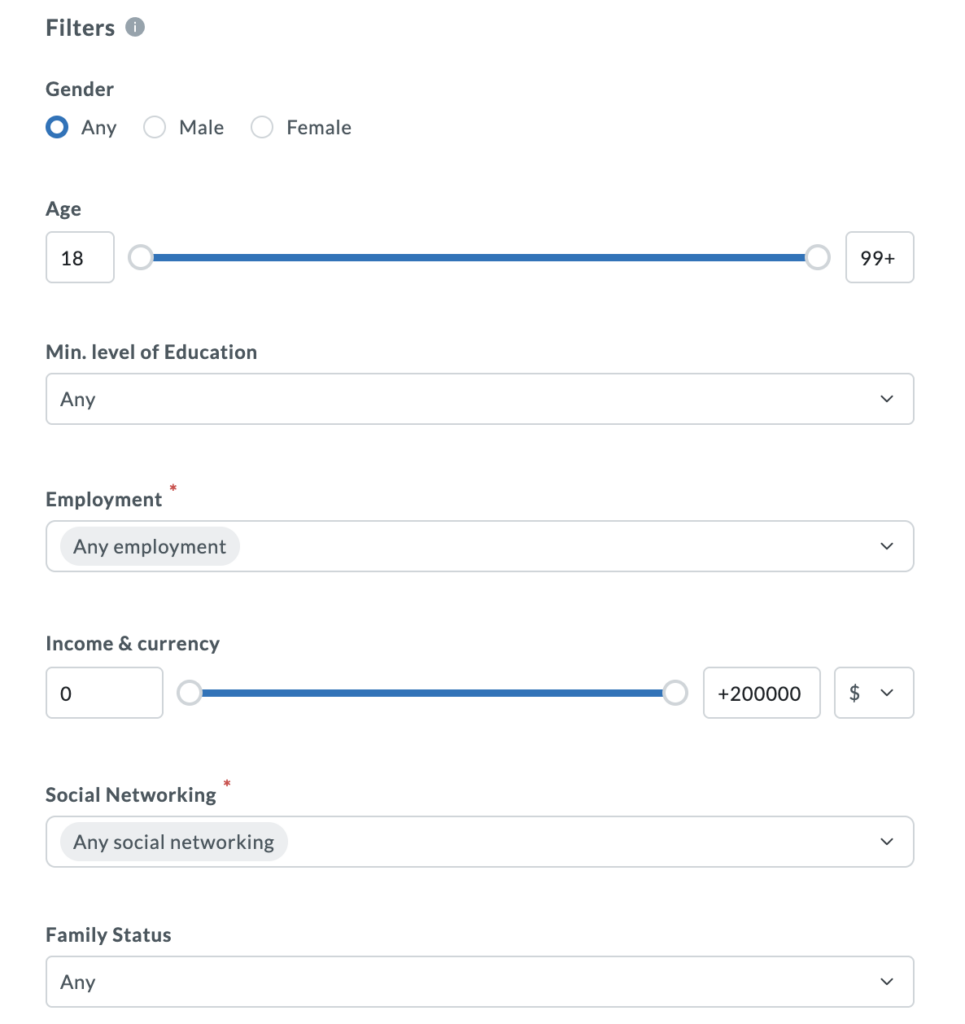 Continue to choose your demographic filling each section under “Filters,” including Gender, Age, level of education, etc.