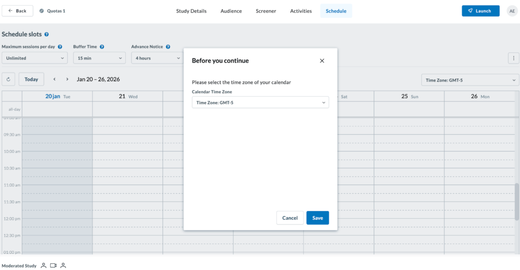 Proceed to schedule your study by choosing time zone, calendar days and times, maximum sessions per day, buffer and advance notice.