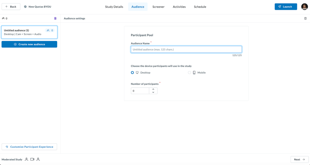 When conducting research with your own participants using the Bring Your Own Users (BYOU) option, the setup process remains intuitive while offering the same powerful multi-audience flexibility.