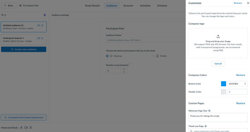 Click the “Customise Participant Experience” button in the bottom-left corner to align the test interface with your brand.