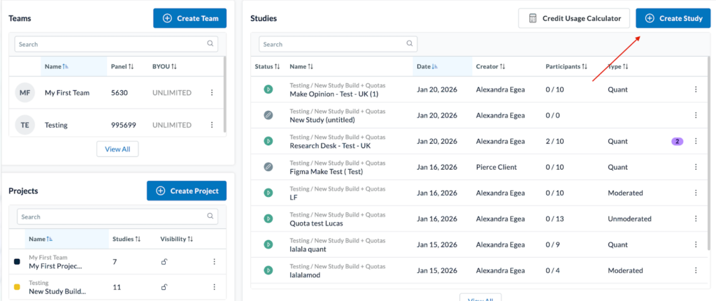 To begin, select the “Create Study” button to launch the Study Builder.