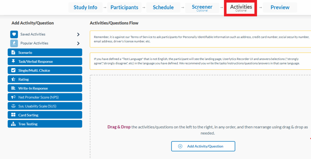 Next, you can define your study activities and create a study script by clicking on “Activities” from within the menu at the top of the screen.