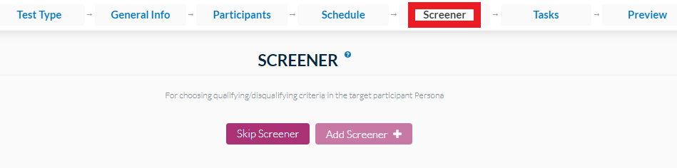 As an added way to ensure your testers fit the exact profile of your target demographic, you may optionally add a screener to the beginning of your study by clicking on “Screener” from within the menu at the top of the screen.