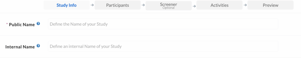 The first aspect of creating your UX study is choosing the right name. You will choose a public name, which all of your participants can see. Additionally, if you would like, you can also select an internal name that only you and your team members will be able to see. The study name should be indicative of the digital asset you are testing.