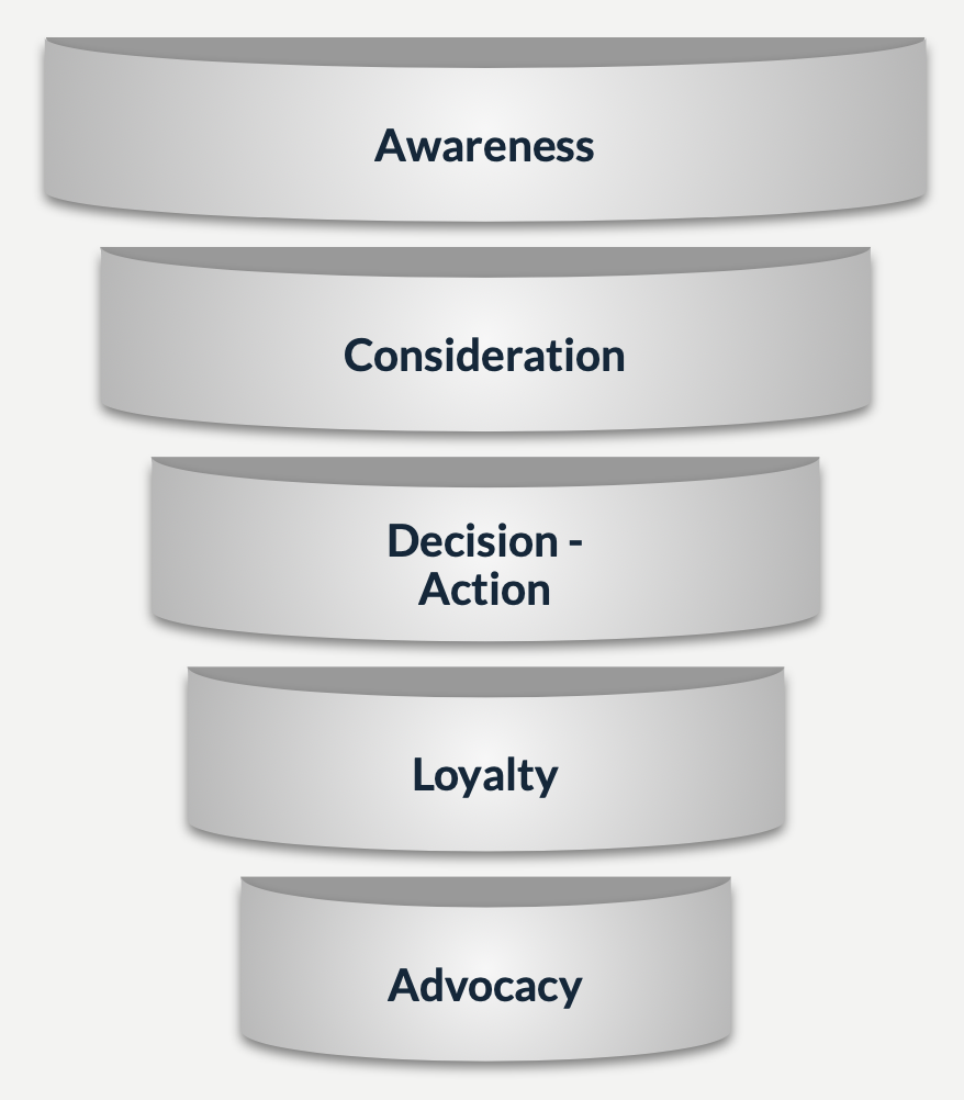 The marketing funnel is made up of five separate stages which outline the customer’s experiences and engagement with your brand, from start to finish. It spans from the very first time they hear about your product, service and brand, all the way down to their post-purchase behaviors. These stages from top to bottom are: